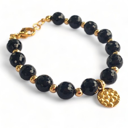 Bracelet made with 8-millimeter black agate and faceted onyx, with a 1 centimeter hammered coin-shaped pendant, in Brazilian gold, with gold-tone steel hardware and balls, length: 8 cm.