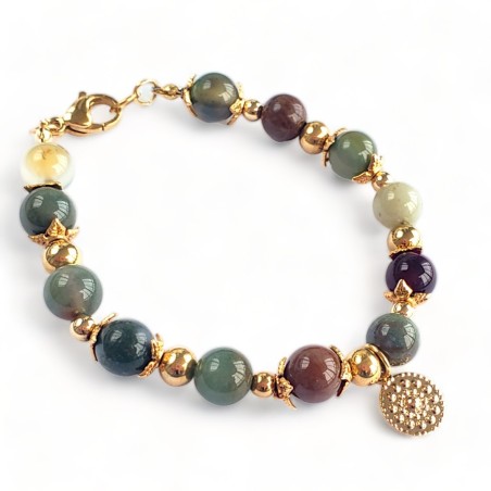 Bracelet composed of 8-millimeter Indian agate stones (earth colors), with a 1-centimeter gold-plated sun coin pendant, 6-millimeter, 4-millimeter steel balls and gold-colored steel details. length 8.5 centimeters.