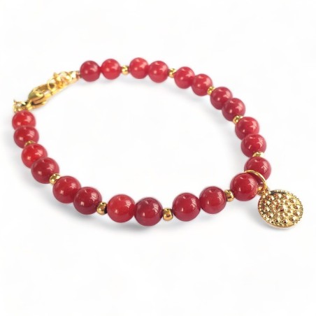 Bracelet made with 6-millimeter red agate stones and gold-colored steel beads, with a 1 cm gold-plated coin pendant.
