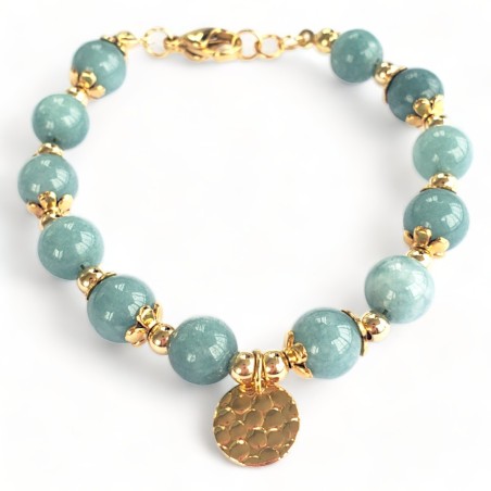 Armband tillverkat av 8 millimeter akvamarin natursten, med ett 1 cm guldfyllt hamrat mynthänge, gyllene stålpärlor och guldstål.