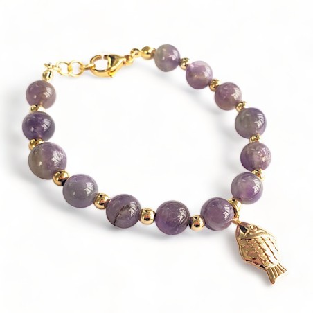 Lyft din stil med detta armband tillverkat av lila ametiststenar och ett charmigt guldpläterat fiskformat hänge.